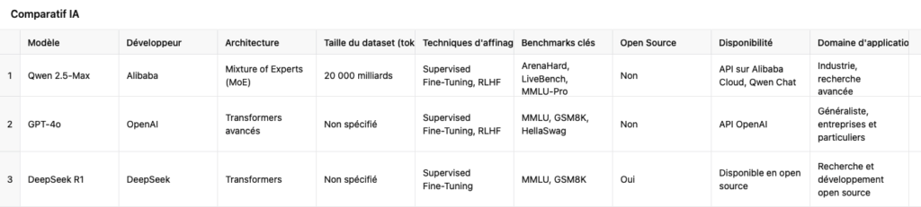 Le Qwen 2.5-Max a été préentraîné sur plus de 20 000 milliards de tokens et affiné à l’aide de techniques avancées telles que le « Supervised Fine-Tuning » et le « Reinforcement Learning from Human Feedback » (RLHF). Ces méthodes lui permettent d’affiner ses réponses et d’améliorer sa compréhension du langage naturel. Selon Alibaba, ce modèle surpasse certains des plus grands noms du secteur, notamment GPT-4o d’OpenAI et Llama 3.1-401B de Meta, sur des benchmarks de référence tels que l’ArenaHard, le LiveBench et le MMLU-Pro.